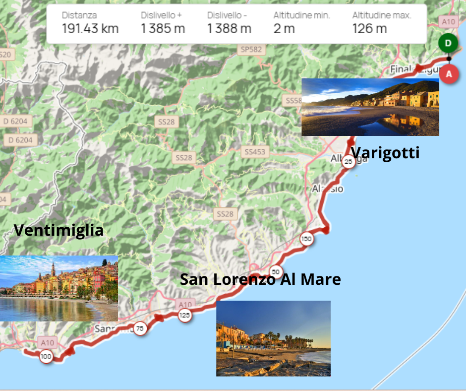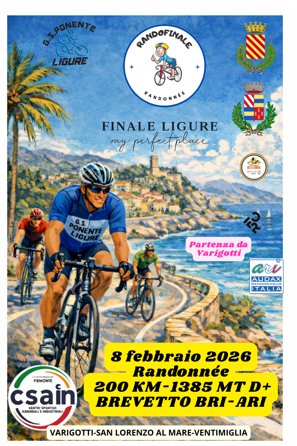 ARI NON E' RESPONSABILE DELLE INFORMAZIONI PUBBLICATE SU QUESTA PAGINA, IL CUI CONTENUTO E' AUTONOMAMENTE GESTITO DALL'ORGANIZZATORE DELL'EVENTO. RandoFinaleDistanza 191 km Dislivello 1385 metri Tempo massimo 13 ore 30 min Dove Finale Ligure (SV) Contatti 3398902248 Partenza 07:30 - 08:30 Omologazione BRI/ARI 200 Km Servizi Iscrizioni dal 01/01/26 al 05/02/26 N. massimo di iscrizioni: 200 Quota di iscrizione Online: 21.00 € NON si ACCETTANO ciclisti non tesserati RandoFinale! PROVA Nord Ovest Master Audax 2026 Partendo da Varigotti, antico borgo saraceno del comune di Finale Ligure, si va in direzione ponente sulla via Aurelia tenendo il mare sulla nostra sinistra per poi affrontare i tre capi della Milano Sanremo Mele,Mimosa e Berta. Giunti ad Imperia ci immettiamo sulla pista ciclabile per poi giunti ad San Lorenzo Al Mare troviamo il primo PUNTO DI CONTROLLO (ristoro). Riprendiamo il nostro viaggio sulla ciclabile sino ad Ospedaletti, quì ritorniamo sulla via Aurelia e la percorriamo sino a Ventimiglia secondo PUNTO DI CONTROLLO (ristoro). Inversione di marcia ci rifermiamo ad San Lorenzo Al Mare terzo PUNTO DI CONTROLLO (ristoro) per giungere al punto di partenza CONTROLLO FINALE (pasta party) ISCRIZIONI: Tramite il sito ARi dal 01/01/2026 a giovedì 5 marzo. Possibilità di iscriversi presso il luogo di ritrovo sabato 6 febbraio dalle ore 15.00 alle ore 18.00 (al costo di euro 30) Per ii NON TESSERATI: possibilità di iscriversi facendo tesssera giornaliera CSAIN al costo aggiuntivo di euro 10 dopo aver presentato il certificato medico vlido con specifica "CICLISMO". direttamente sul posto sabato pomeriggio dalle ore 15.00 alle ore18.00. RITROVO: Varigotti (Finale Ligure) Centro Civico Roberto Fontana Via Aurelia 233 RITIRO CARTA DI VIAGGIO: sabato 07/02/2026 dalle ore 15.00 alle ore 18.00 domenica 08/02/2026 dalle ore 06.30 alle ore 08.30 PARTENZA: Alla Francese (scaglionata) dalle ore 07.30 alle ore 08.30 PUNTI DI CONTROLLO: N° 1 Varigotti (Partenza) km 0 N° 2 San Lorenzo Al Mare KM 61 N°3 Ventimiglia km 96 N° 4 San Lorenzo Al Mare KM 131 N°5 Varigotti (Arrivo) km 191 IN CASO DI ALLERTA METEO ARANCIONE/ROSSA LA MANIFESTAZIONE SARA' ANNULLATA