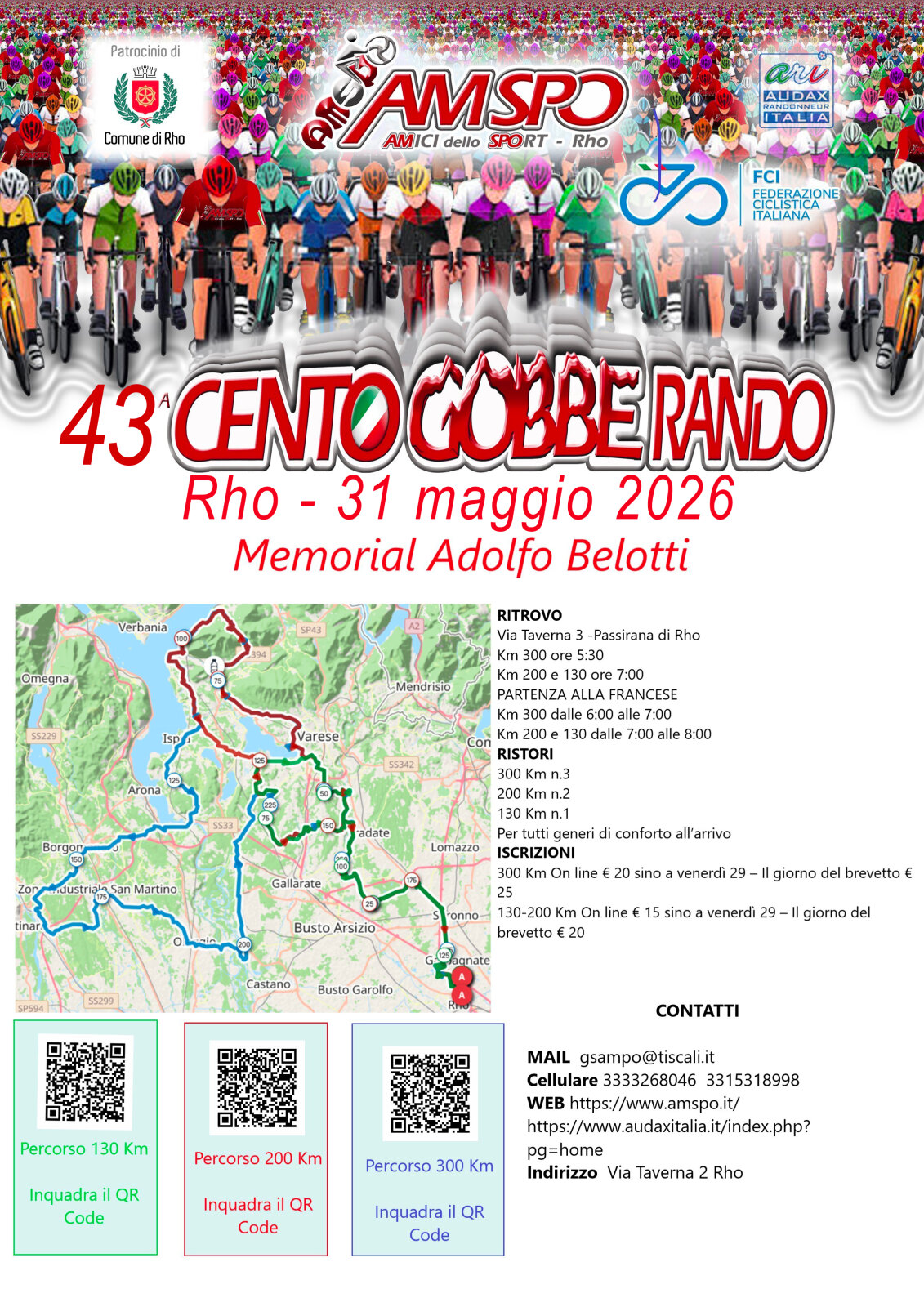 ARI NON E' RESPONSABILE DELLE INFORMAZIONI PUBBLICATE SU QUESTA PAGINA, IL CUI CONTENUTO E' AUTONOMAMENTE GESTITO DALL'ORGANIZZATORE DELL'EVENTO. 100 GOBBE RANDODistanza 194 km Dislivello 2121 metri Tempo massimo 13 ore 30 min Dove Rho (MI) Contatti 3333268046 - 3315318998 Partenza 08:00 - 09:00 Omologazione BRM/ACP 200 Km Servizi Iscrizioni dal 01/05/26 al 31/01/26 Quota di iscrizione Online: 15.00 €