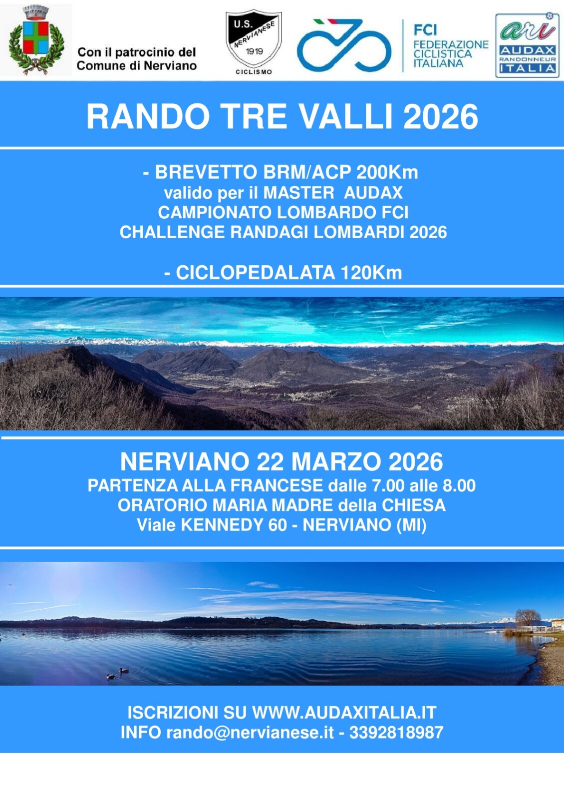 ARI NON E' RESPONSABILE DELLE INFORMAZIONI PUBBLICATE SU QUESTA PAGINA, IL CUI CONTENUTO E' AUTONOMAMENTE GESTITO DALL'ORGANIZZATORE DELL'EVENTO. TRE VALLI - 200 kmDistanza 205 km Dislivello 2500 metri Tempo massimo 13 ore 30 min Dove Nerviano (MI) Contatti 3392818987 Partenza 07:00 - 08:00 Omologazione BRM/ACP 200 Km Iscrizioni dal 01/03/26 al 19/03/26 Quota di iscrizione Online: 20.00 € NON si ACCETTANO ciclisti non tesserati LA TRACCIA SCARICABILE PUO' ESSERE SOGGETTA A MODIFICHE, DOPO AVER VERIFICATO LE CONDIZIONI DEL PERCORSO. SI CONSIGLIA DI SCARICARLA IL GIORNO PRIMA DELLA PARTENZA. PROVA VALIDA: - BREVETTO BRM/ACP - MASTER AUDAX E GRAN PRIX – ARI - CAMPIONATO LOMBARDO FCI 2026 - CHALLENGE RANDAGI LOMBARDI 2026 La Randonnèe da 200Km attraversa le classiche 3 valli Varesine : Valcuvia, Valtravaglia e Valganna, lungo le quali si affronteranno alcune delle numerose salite delle valli Varesine.