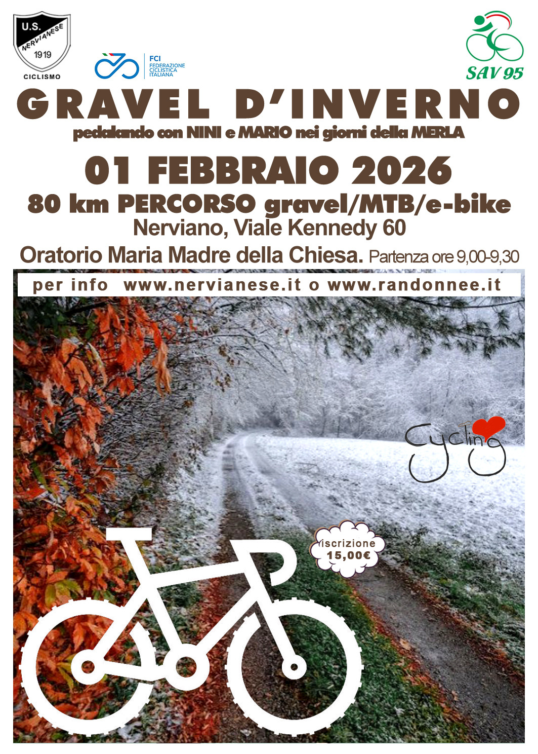 ARI NON E' RESPONSABILE DELLE INFORMAZIONI PUBBLICATE SU QUESTA PAGINA, IL CUI CONTENUTO E' AUTONOMAMENTE GESTITO DALL'ORGANIZZATORE DELL'EVENTO. RANDO D'INVERNO - GRAVELDistanza 75 km Dislivello 600 metri Tempo massimo 6 ore Dove Nerviano (MI) Contatti 3481513404 Partenza 09:00 - 09:30 Omologazione BOR/ARI 80 KM GRAVEL Iscrizioni dal 02/01/26 al 30/01/26 Quota di iscrizione Online: 15.00 € RITROVO E ORARI Per le iscrizioni in loco, presso l'Oratorio di Maria Madre della Chiesa, Viale Kennedy, 60 a Nerviano apertura Sabato 31 Gennaio,dalle 14.30 alle 17.30. Il ritrovo della partenza, 1 Febbraio, sarà presso l'Oratorio di Maria Madre della Chiesa, Viale Kennedy, 60 a Nerviano. Partenza, alla francese, tra le 9.00 e le 9.30 tempo massimo per il rientro è previsto per le ore 14.00 All’arrivo ristoro per tutti. Informazioni: tel. 334-3789093 | 348-2557561 MODALITÀ ISCRIZIONI ON-LINE del ciclistaSocio ARIIl ciclista socio ARI, dopo essersi "loggato" viene riconosciuto dal server ARI che verifica che la data della visita medica depositata in DataHealth sia valida nella data del Brevetto (se fosse scaduta gli chiede di aggiornarla) e gli permette di iscriversi immediatamente, senza dover inserire i propri dati, procedendo al pagamento della quota di iscrizione scontata. Non socio ARIARI e gli Organizzatori associati utilizzano il servizio DataHealth per la verifica e l’archiviazione dei certificati medici. Il sistema, prima di aprire la scheda iscrizioni chiede di inserire il proprio CODICE FISCALE per verificare su DataHealth se sei registrato e hai la visita medica valida. Si presentano perciò due casi: - IL SISTEMA TROVA VISITA MEDICA VALIDA su DH > Sei certificato perché a suo tempo hai già fatto la procedura di inserimento in DataHealth per un precedente Brevetto ARI o per una GF che lo aveva richiesto. Quindi PUOI PROCEDERE > si apre la scheda iscrizioni da compilare. - IL SISTEMA NON TROVA LA VISITA MEDICA VALIDA > NON sei certificato in DataHealth.