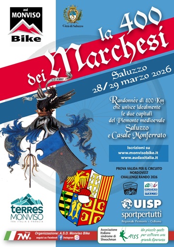 ARI NON E' RESPONSABILE DELLE INFORMAZIONI PUBBLICATE SU QUESTA PAGINA, IL CUI CONTENUTO E' AUTONOMAMENTE GESTITO DALL'ORGANIZZATORE DELL'EVENTO. LA 400 DEI MARCHESIDistanza 390 km Dislivello 2700 metri Tempo massimo 27 ore Dove Saluzzo (CN) Contatti 3456003559 Partenza 15:00 - 16:00 Omologazione BRM/ACP 400 KM Servizi Iscrizioni dal 23/02/26 al 26/03/26 Quota di iscrizione Online: 26.00 €