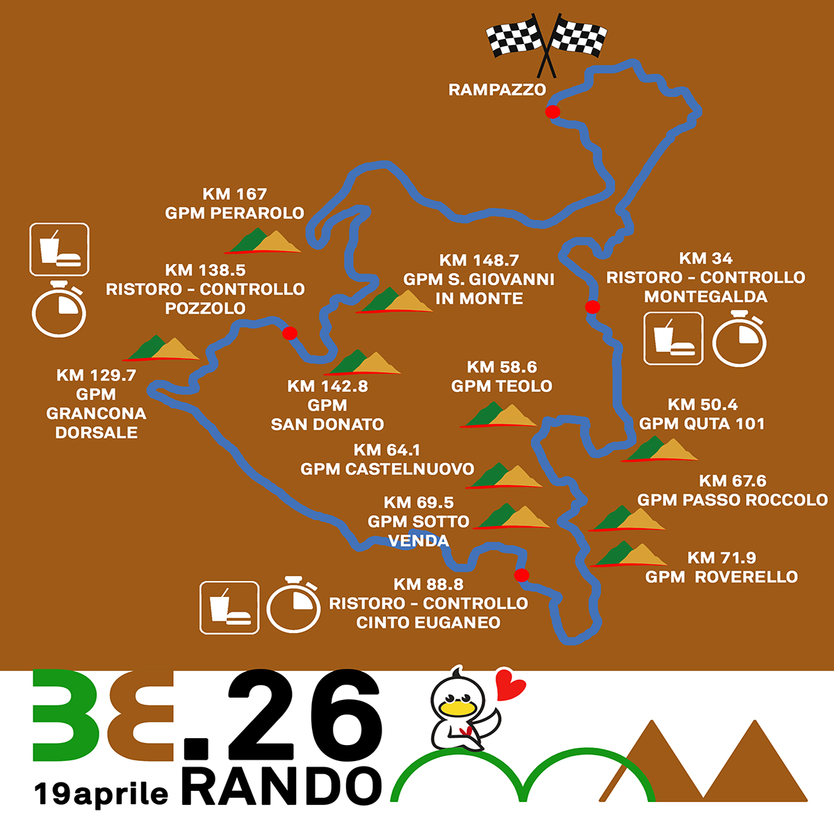ARI NON E' RESPONSABILE DELLE INFORMAZIONI PUBBLICATE SU QUESTA PAGINA, IL CUI CONTENUTO E' AUTONOMAMENTE GESTITO DALL'ORGANIZZATORE DELL'EVENTO. LA BERICO EUGANEA 200Distanza 201 km Dislivello 2300 metri Tempo massimo 13 ore 30 min Dove Camisano Vicentino (VI) Contatti 3287312328 Partenza 07:30 - 08:30 Omologazione BRI/ARI 200 Km Servizi Iscrizioni dal 02/02/26 al 17/04/26 N. massimo di iscrizioni: 300 Quota di iscrizione Online: 20.00 € Si ACCETTANO anche ciclisti non tesserati con richiesta di contributo assicurativo giornaliero di € 10.00 RANDO-BERICO EUGANEA - DOMENICA 19 APRILE 2026 Partenza dalle 7.30 alle 8.30 Torna anche questo anno la RBE.26, La Rando Berico Euganea 10^ edizione. Partenza e arrivo presso il Campo Sportivo “don Daniele Parlato” via Chiesa 17/a frazione Rampazzo di Camisano Vicentino. Ampi parcheggi in zona anche per camper. Percorso rinnovato 200 km 2400 mt di dislivello. In questa edizione si ritorna a girare in senso orario, quindi prima gli Euganei e dopo i Berici. Anche quest'anno si utilizzerà il sistema classico dei cartellini di timbratura. I ristori e i punti di timbratura saranno presidiati da nostro personale. Particolarità di quest’anno i colli Euganei e Berici li si vedranno dall’alto. Infatti, il percorso 2026 si contraddistingue dal percorrere le dorsali dei colli restando spesso in quota. La prima parte del percorso pianeggiante, toccherà Piazzola sul Brenta con la sua Villa Contarini opera del Palladio per il lungo, per poi arrivare a Montegalda dove ci sarà il primo punto controllo e ristoro colazione (35 km lungo – 16 km corto). Dopo il primo controllo ci si dirigerà verso i colli Euganei, prima salita per quota 101 (90 mt), discesa rapida e poi si salirà verso Teolo (215 mt) per poi proseguire sulla dorsale degli Euganei scendendo ad Arquà Petrarca. Non mancheranno strappi come Castelnuovo (295 mt), il passo Roccolo (355 mt), SottoVenda (338 mt) il Roverello (338 mt) e il Pianoro del Mottolone (235 mt). Scesi ad Arquà si andrà verso Baone per poi raggiungere Cinto Euganeo per il secondo controllo e ristoro (89 km). A Cinto Euganeo ci sarà la divisione dei percorsi, il corto proseguirà verso la salitella di Albettone per poi raggiungere i colli Berici affrontando la salita per Villaga, Barbarano Vicentino e percorrere i saliscendi fino a Longare e poi proseguire per gli ultimi chilometri di pianura fino all’arrivo (121 km – 1250 mt di dislivello complessivi). Il 200 km invece si dirigerà verso Noventa Vicentino e Lonigo. Qui si prenderà la prima dorsale dei Berici dove si raggiungeranno i 250 mt dirigendosi verso Grancona. Qui scenderete in valle per poi prendere la salita verso la seconda dorsale dirigendosi verso l’altipiano di Pozzolo dove sarà presente il terzo punto controllo e ristoro (140 km). Si salirà ancora verso l’eremo di san Donato (376 mt), per poi seguire il crinale fino e San Giovanni in Monte (410 mt). Da qui si scenderà verso Lapio e Torri di Arcugnano con vista sulla valle del lago di Fimon. Arrivati in valle si affronterà l’ultima salita verso Perarolo (233 mt) per poi proseguire sull’ultima dorsale verso Arcugnano. Qui scenderemo verso la pianura dove gli ultimi 25 km pianeggianti ci porteranno all’arrivo e al meritato pasta party. (201 km – 2300 mt di dislivello). ISCRIZIONI Costo iscrizione 20,00€ fino al 15/03/2025 Costo iscrizione 25,00€ fino al 17/04/2025 30,00€ il giorno della manifestazione presso la partenza Le iscrizioni potranno essere fatte tramite il sito www.audaxitalia.it Sara possibile iscrivere anche atleti non tesserati, o tesserati ad altri enti non riconosciuti, comunque con certificato medico valido per pratica ciclismo , previa sottoscrizione di una tessera giornaliera dal costo di 10€. Giorno massimo per iscrizione atleti non tesserati giovedì 16 aprile. Non si accettano iscrizioni di atleti non tesserati il giorno dell'evento. LA DICHIARAZIONE DI CONSAPEVOLEZZA (LIBERATORIA), MEDICA SPORTIVA, TESSERA SOCIETA’ (moduli scaricabili sulla pagina della manifestazione sul sito www.audaxitalia.it) Dovranno essere mandati via mail a asd.cycling3e60@gmail.com Questa manifestazione è inserita nel campionato Triveneto randonnèe facente parte del programma Girorando del Nordest Per informazioni: www.facebook.com/cycling3e60, asd.cycling3e60@gmail.com, www.audaxitalia.it www.cycling3e60vicenza.it Parte del ricavato sarà devoluto in beneficenza alle Associazioni del territorio. MODALITÀ ISCRIZIONI ON-LINE del ciclistaSocio ARIIl ciclista socio ARI, dopo essersi "loggato" viene riconosciuto dal server ARI che verifica che la data della visita medica depositata in DataHealth sia valida nella data del Brevetto (se fosse scaduta gli chiede di aggiornarla) e gli permette di iscriversi immediatamente, senza dover inserire i propri dati, procedendo al pagamento della quota di iscrizione scontata. Non socio ARIARI e gli Organizzatori associati utilizzano il servizio DataHealth per la verifica e l’archiviazione dei certificati medici. Il sistema, prima di aprire la scheda iscrizioni chiede di inserire il proprio CODICE FISCALE per verificare su DataHealth se sei registrato e hai la visita medica valida. Si presentano perciò due casi: - IL SISTEMA TROVA VISITA MEDICA VALIDA su DH > Sei certificato perché a suo tempo hai già fatto la procedura di inserimento in DataHealth per un precedente Brevetto ARI o per una GF che lo aveva richiesto. Quindi PUOI PROCEDERE > si apre la scheda iscrizioni da compilare. - IL SISTEMA NON TROVA LA VISITA MEDICA VALIDA > NON sei certificato in DataHealth.