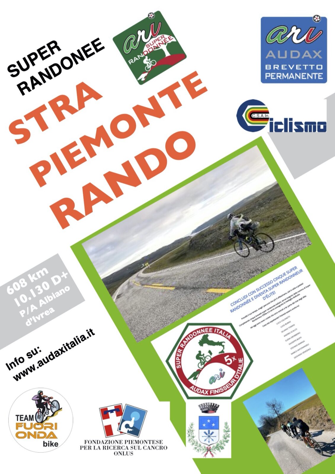 ARI NON E' RESPONSABILE DELLE INFORMAZIONI PUBBLICATE SU QUESTA PAGINA, IL CUI CONTENUTO E' AUTONOMAMENTE GESTITO DALL'ORGANIZZATORE DELL'EVENTO. STRA PIEMONTE SRDistanza 606 km Dislivello 10400 metri Dove Albiano d'Ivrea (TO) Contatti 3472564008 Servizi Quota di iscrizione Online: 35.00 € Percorso in senso anti orario che ripercorre le strade della leggenda dei ciclisti, colli e collette che hanno visto le grandi Tappe o gare dei professionisti (Giro d'Italia, Milano-Torino, Gran Piemonte, ecc.) Strade secondarie a basso traffixco che hanno storia, borghi da attraversaRe, curiosità e tanta natura.