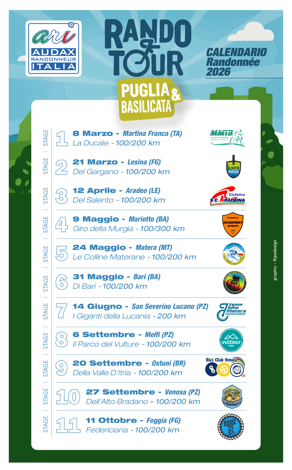 ARI NON E' RESPONSABILE DELLE INFORMAZIONI PUBBLICATE SU QUESTA PAGINA, IL CUI CONTENUTO E' AUTONOMAMENTE GESTITO DALL'ORGANIZZATORE DELL'EVENTO. RANDO TOUR PUGLIA E BASILICATA 2026Distanza 2300 Km totali Contatti 3355710096 Il Rando Tour Puglia e Basilicata è un nuovo circuito di randonnée che nasce con l’obiettivo di promuovere il ciclismo di lunga distanza e valorizzare il patrimonio paesaggistico, culturale e umano delle regioni Puglia e Basilicata. Il progetto prende forma grazie alla collaborazione di 11 società ciclistiche attive sul territorio, che hanno unito competenze, esperienza organizzativa e passione per la randonnée, dando vita a un circuito condiviso e coordinato nel rispetto dei principi e dei regolamenti Audax. Il circuito comprende 11 appuntamenti randonnée, distribuiti nel corso dell’anno, ciascuno caratterizzato da percorsi studiati per offrire ai randonneur itinerari di qualità, sotto il profilo sportivo e paesaggistico. Le tracce attraversano borghi storici, aree rurali, zone collinari e montane, contesti costieri e ambienti naturali di particolare pregio, offrendo un’esperienza autentica e coinvolgente. Il Rando Tour Puglia e Basilicata si propone come strumento di promozione del ciclismo di resistenza e del turismo lento, favorendo una fruizione consapevole del territorio e contribuendo alla diffusione dei valori fondanti della randonnée: autonomia, rispetto delle regole, spirito di solidarietà, condivisione e passione per il viaggio in bicicletta. Ogni manifestazione inserita nel circuito è organizzata secondo i regolamenti vigenti e aperta a tutti i randonneur, con distanze e percorsi differenziati, in grado di accogliere sia chi si avvicina per la prima volta alla disciplina, sia chi possiede una maggiore esperienza nel ciclismo di lunga distanza. Il calendario del Rando Tour Puglia e Basilicata rappresenta un percorso ideale attraverso due regioni ricche di storia e tradizioni, offrendo ai partecipanti l’opportunità di vivere la randonnée come esperienza sportiva e culturale, nel segno della continuità, della collaborazione tra società e della crescita del movimento Audax nel Sud Italia. Di seguito è riportato il calendario ufficiale degli appuntamenti che compongono il Rando Tour Puglia e Basilicata.