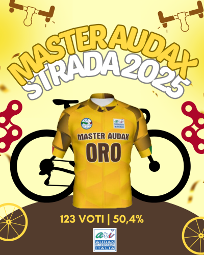 mercoledì 01 ottobre, 2025 AND THE WINNER IS....![]() Lo scorso 12 settembre vi avevamo chiesto di scegliere la grafica che preferivate per coloro che, a fine ottobre, avranno raggiunto il traguardo Master Audax Strada Oro. Abbiamo registrato i vostri voti fino alla mezzanotte del 30 settembre. La grafica più votata, con 123 preferenze e ben il 50,4% dei favori, è stata la maglia che vedete nell'immagine. I nostri sarti di fiducia di Bicycle Line, sono già all'opera per realizzarla, di modo da poterla consegnare al Meeting di Matera. Grazie della partecipazione!